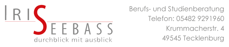 Iris Bister-Seebass Berufs- und Studienberatung an neuem Standort: Mehr als zehn Jahre habe ich erfolgreich das von mir gegründete „Bildungsinstitut Iris Seebass“ in Lengerich geleitet. Nun habe ich entschieden, mich stärker auf den Bereich der Berufsberatung zu konzentrieren, während ich das Nachhilfe-Angebot an einen Nachfolger übergeben habe.